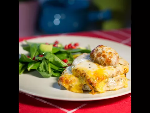 1 pork fillet 1 chicken breast salt pepper oregano 1 teaspoon olive oil 1 tablespoon vegetable oil 0.5 ounce - mozzarella, grated 0.5 ounce - cheddar cheese, grated 1 baby spinach 1 avocado, cut into pieces ½ teaspoon pomegranate seed ¼ lime 1 teaspoon olive oilHow to Make Pork and Chicken Steak With Cheesy Crust