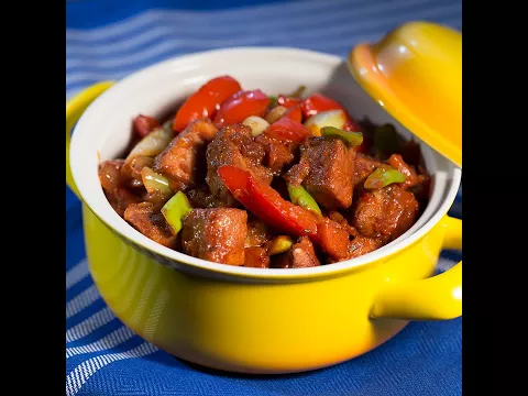 7 ounces of pork tenderloin, cut into cubes vegetable oil ½ white onion, diced 1 red bell pepper, chopped 5 garlic cloves ¼ teaspoon cumin seeds ½ cup red wine 1 spring onion, slices 1 teaspoon mustard ⅓ cup tomato sauce salt pepper 1 teaspoon mustardHow to Make Pork and Veggie Casserole