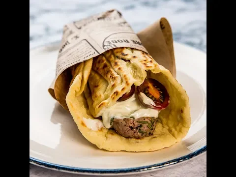 - Wrap each souvlaki with a pita, remove the wooden skewer, add some tzatziki and cherry tomatoes, and serve.