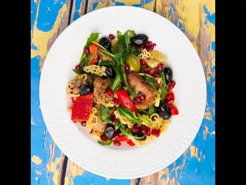 - Add the cooked pasta in a bowl, then add the picked red bell pepper, arugula, black and green olives, and pork pieces.