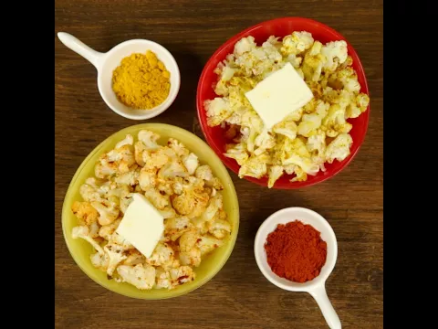 - Take the cauliflower out of the oven and put in a bowl the one with curry and in other bowl the one with paprika.