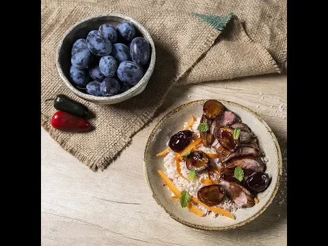- Transfer the seared duck breast to a baking dish and add the plums.