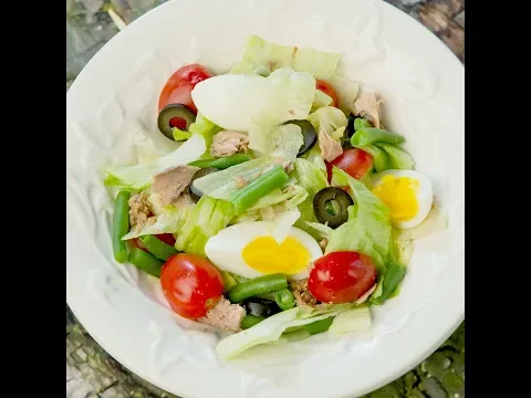 - Add the lettuce, canned tuna, olives, cherry tomatoes, cooked green beans, and boiled egg to a bowl.