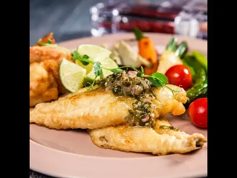 - Coat the fillets and prawns with flour and beer batter and transfer them to the frying pan. Deep-fry for 6 – 8 minutes on both sides.