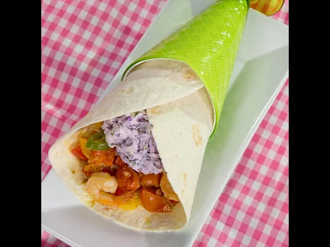 20 shrimp 4 ounces of cherry tomato 1 yellow bell pepper 1 red bell pepper 3 garlic cloves 2 mushrooms 1 green chili 2 tablespoons of vegetable oil ¼ red cabbage, shredded 0.25 white cabbage, shredded 4 broccoli florets, cooked and diced ¼ cup yogurt 1 basil leaves 2 tortilla wraps 2 tablespoons of mayonnaiseHow to Make Shrimp and Veggie Tortilla Wrap