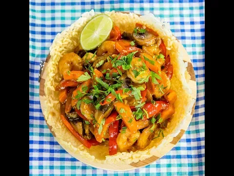 - Fill the rice bowl with the shrimp stew, garnish with fresh parsley, add lime wedges and serve.