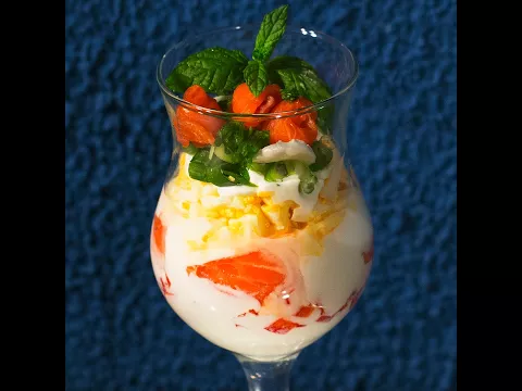- On top, add half of the bell peppers, 1-2 salmon slices, yogurt, egg, yogurt again, and top it with spring onion and a few bocconcini slices.