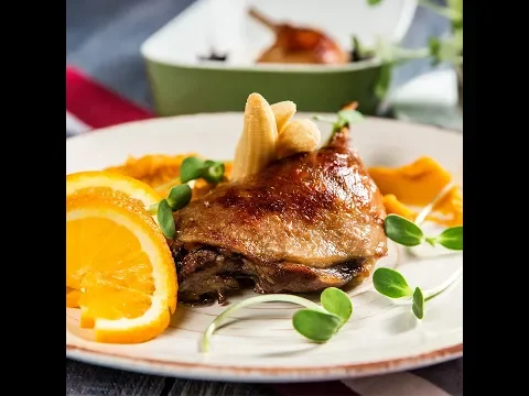 - Serve the duck legs with some squash puree. Optionally, you can garnish with orange slices and baby corn.
