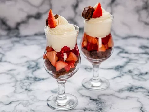 - Add the strawberries and raspberries and top with the whipped cream. You can add the cream using a piping bag. Garnish with strawberry and chocolate loaf piece.