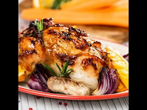 - Transfer the stuffed chicken to a roomy baking dish. Add the quartered red onion, the remaining halved carrots, and orange wedges.