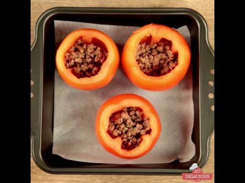 - In every tomato, put 2-3 tablespoons of cooked minced meat.