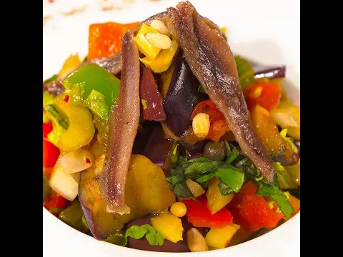 2 tablespoons of vegetable oil 1 eggplant, diced 1 onion, diced 2 celerys sticks 0.5 green bell pepper ½ red bell pepper 1 garlic 1 tomato chili flakes ½ tablespoon pine nut salt pepper 5 olives, pitted 1 teaspoon caper 1 tablespoon red wine vinegar 2 tablespoons of sugar 1 tablespoon olive oilHow to Make Warm Vegetable and Anchovy Salad