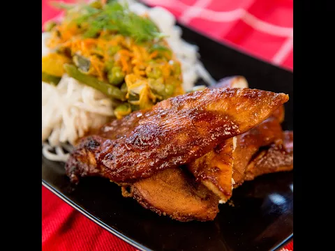 - Take the chicken out of the oven, place it on a large plate, and serve it with the noodles and veggies.