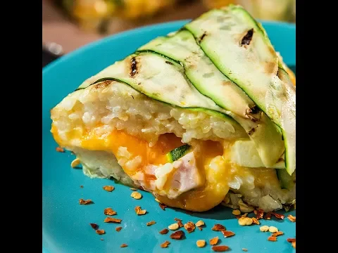 - Add the ham, zucchini cubes, cheddar, and mozzarella. Top with the remaining rice.