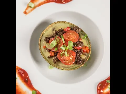 - Stuff the avocado halves with the beef mixture, then decorate with cherry tomato slices and red bell pepper. Place the stuffed avocados into a baking tray and move to the oven. Bake for 10 minutes.